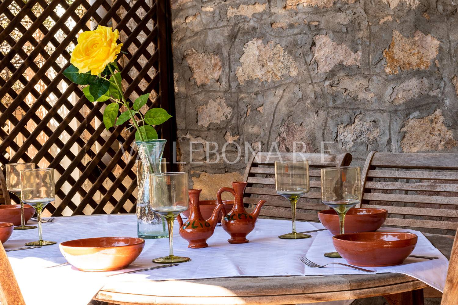 1) Casa in pietra: soggiorno con angolo cottura, 2 camere matrimoniali (di cui una con 3 posti letto), 2 camere doppie, 2 bagni.